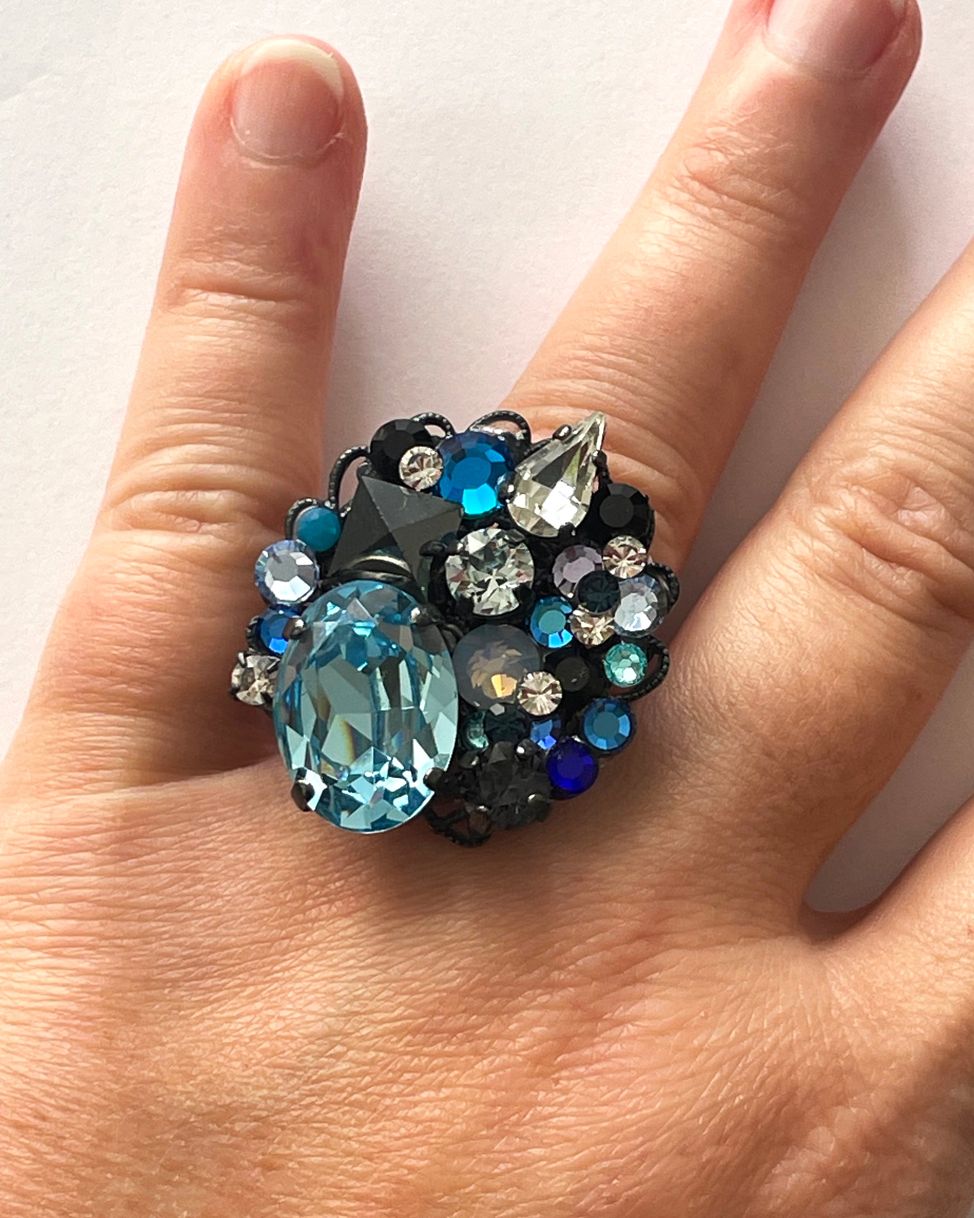 Statement cocktail ring made with a selection of Swarovski crystal stones in a wide variety of colours: Aquamarine, Meridian Blue, Sky opal, Hematite and Jet to name a few.